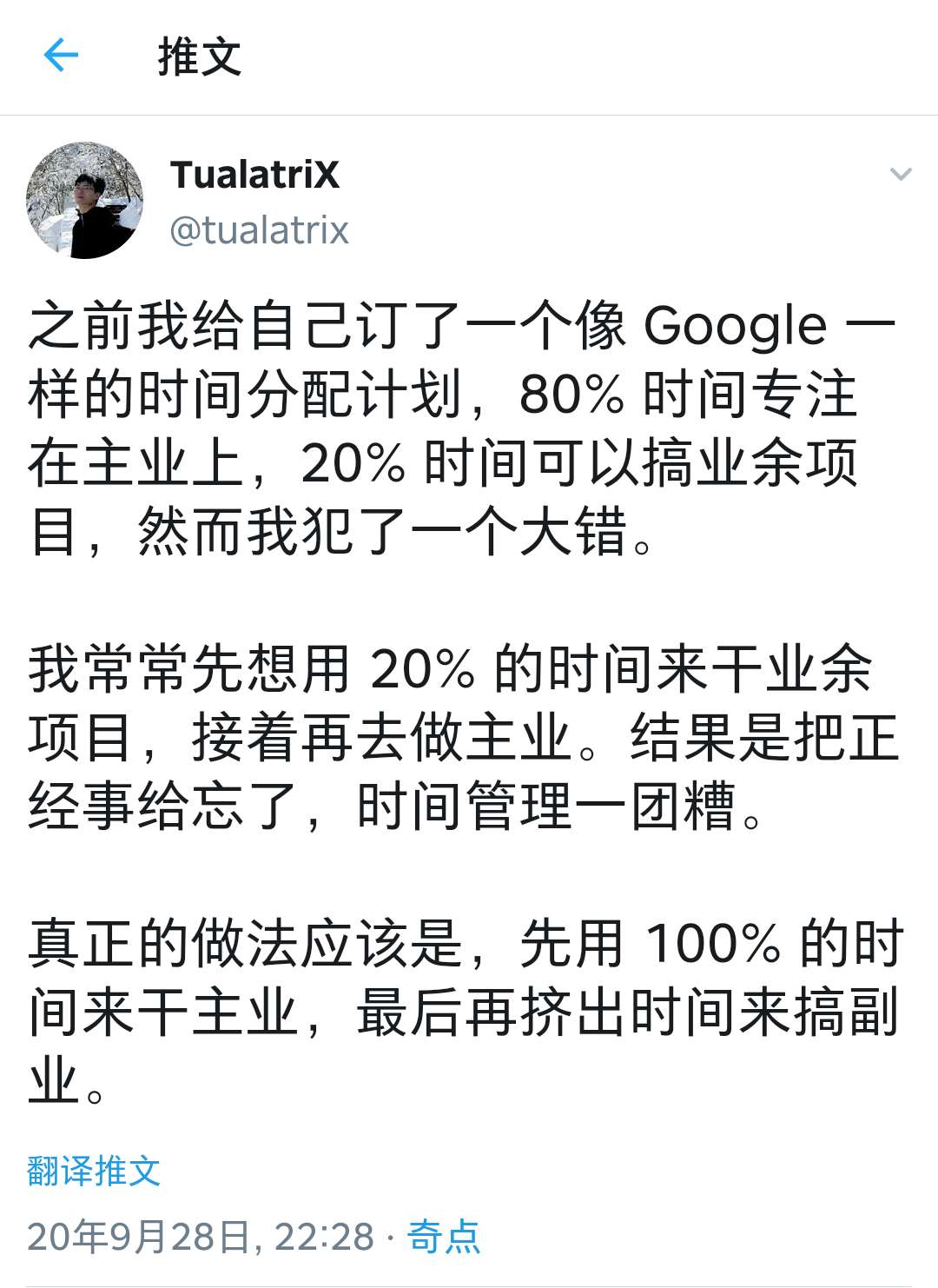 软件行业一直流行着Google公司的一个文化:”20%时间搞业余项目”。直到前段时间,我在外网看到@tualatrix分享的这个观点,一下子恍然大悟,Google公司的这个观点对我们绝大多数人来说,可能是不合适的。
